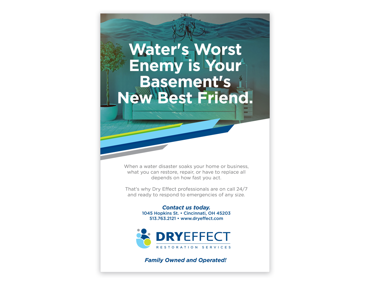 The graphic system contains a rigid shape structure that provides an eye-catching contrast to the logo. Its fresh and clean personality is trustworthy and approachable with a touch of lighthearted whimsy in its photography. At a time when a homeowner is stressed and desires a tidy outcome, the Dry Effect brand promises a reliable job well done.
